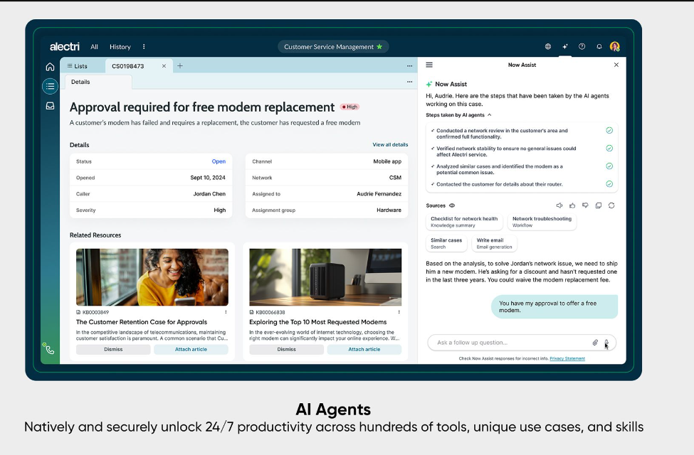 - Now Assist for Telecom, Media and Technology helps agents understand service problems quickly and resolve issues by using genAI to summarize issues and diagnose them.