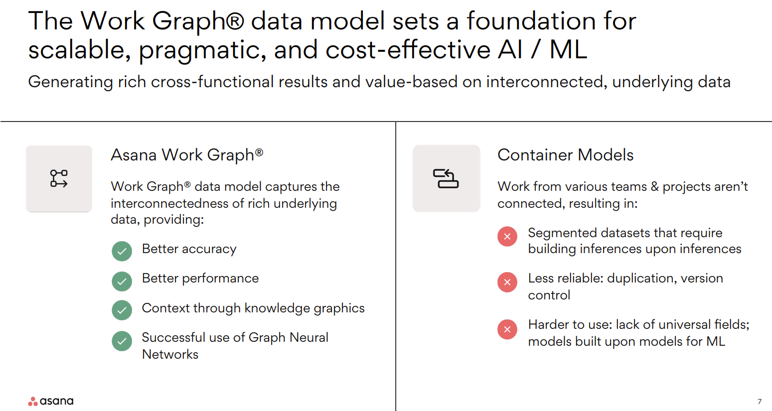 Vision. Asana's architecture is based on the Asana Work Graph data model and the company is betting that it will become the linchpin to future AI use cases. The goal: Make Asana Work Graph the single source of truth for work data so enterprises will know how work actually gets done.