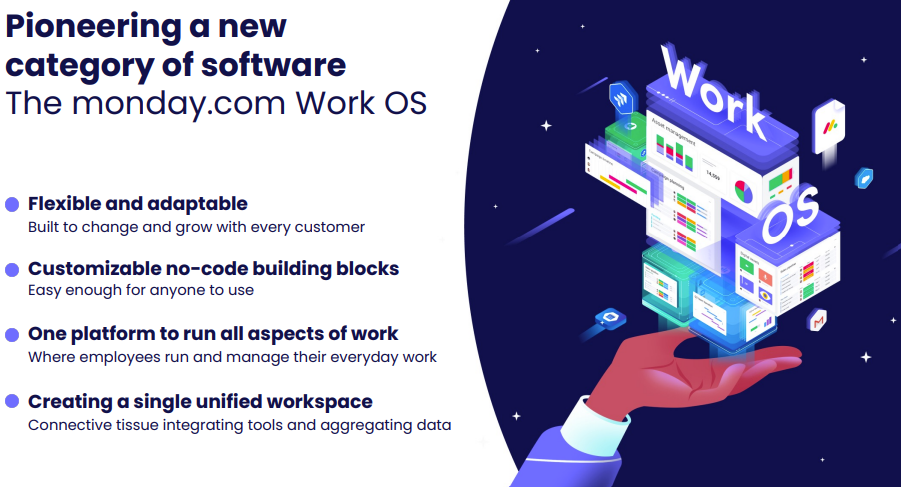 Vision. Monday.com has rebuilt the infrastructure behind its Work OS platform. It has launched the Monday DB 1.0 to all accounts so customers can load large boards 5 times faster and manage complicated workflows. Monday.com is also building out its developer marketplace to develop more AI applications. Monday.com is also optimizing its interface.