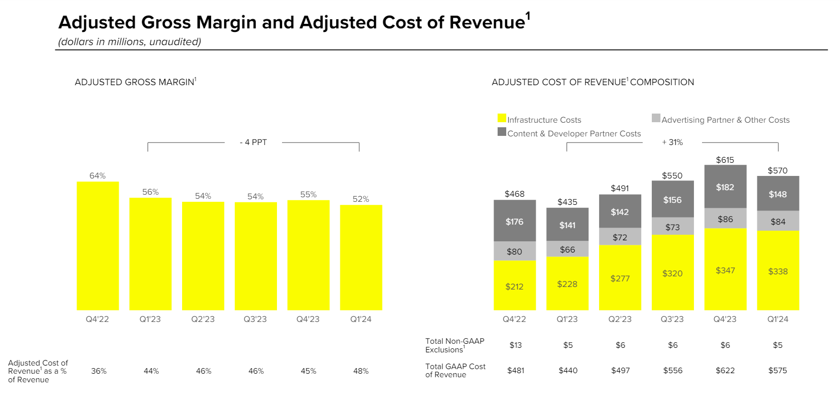 "We benefited from higher-than-average service provider credits in Q1 that helped to further reduce infrastructure costs in Q1. As a result, infrastructure cost per DAU declined from $0.84 in Q4 of 2023 to $0.80 in Q1 of 2024."