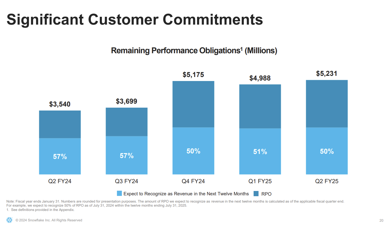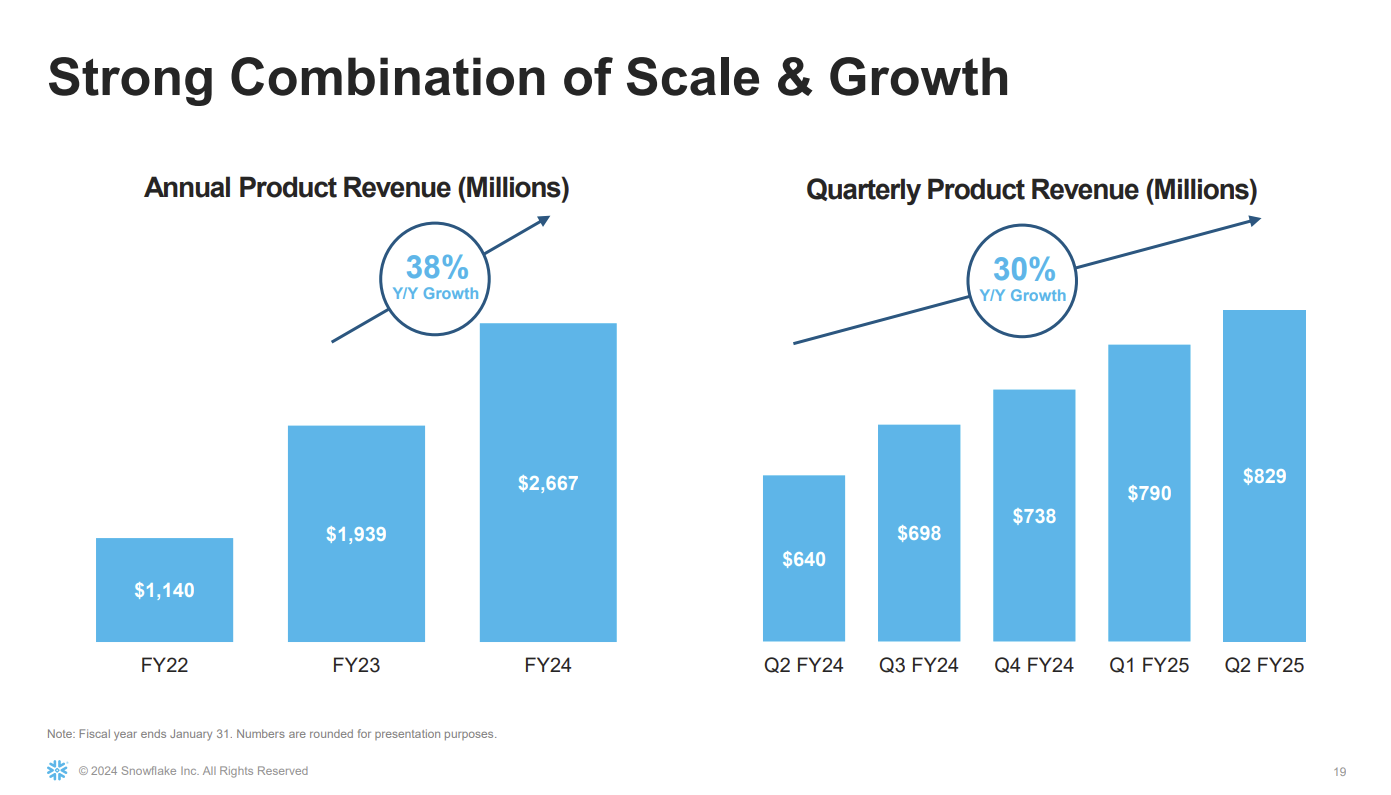 As for the financial outlook, Snowflake projected third quarter product revenue of $850 million to $855 million, up 22%. For fiscal 2025, Snowflake sees product revenue of $3.356 billion, up 26%.