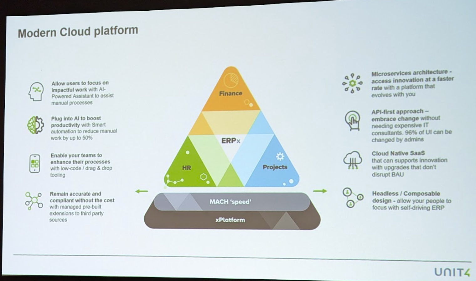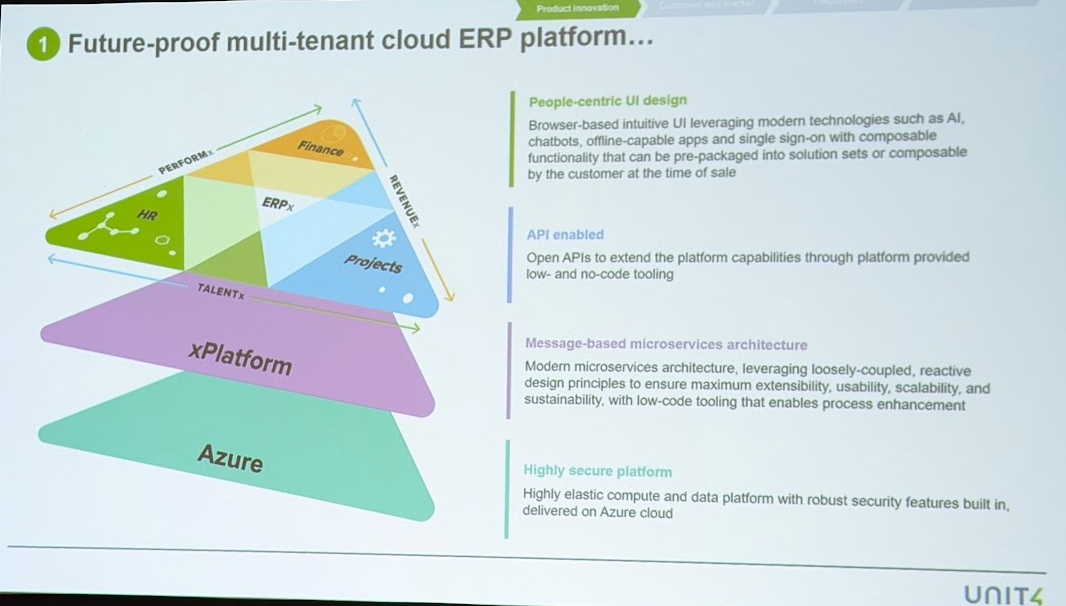 Unit4, which has â¬425 million in revenue, ARR growth of 25 and cloud ARR growth of more than 25%, has been on a transformation of its own since 2021 to evolve the product and support it. The company has migrated to the cloud, focused on ERP workflows and integrated automation with robotics process automation with the ability to swap into generative AI.