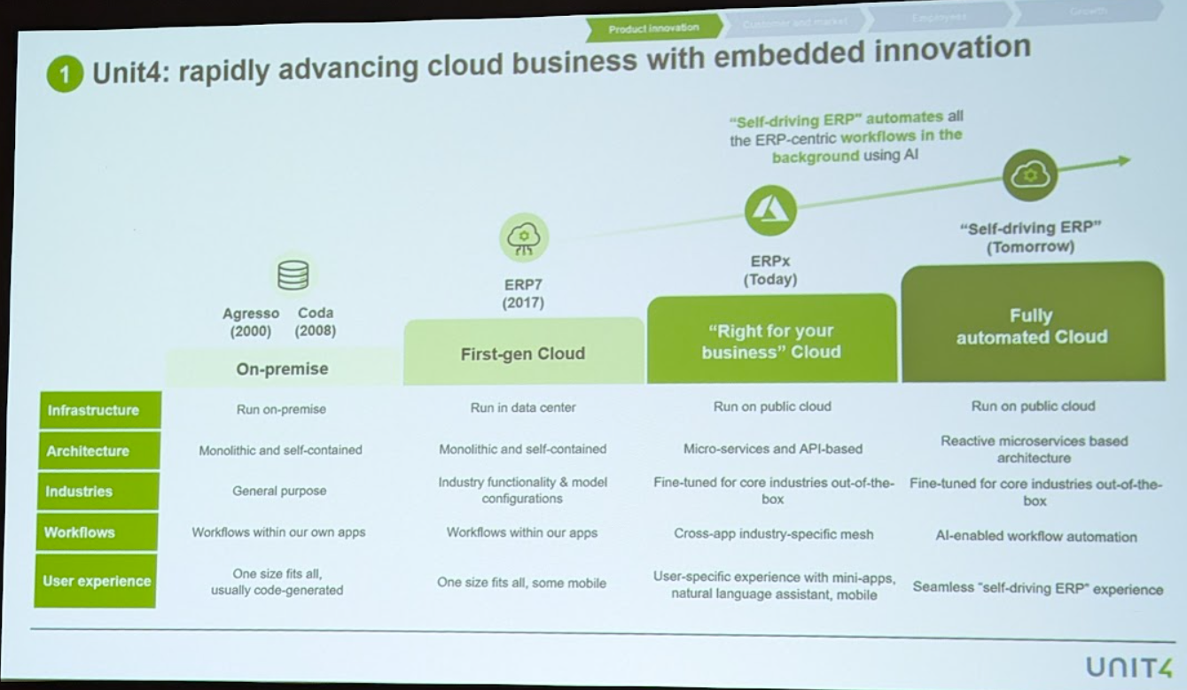 The Unit4 strategy revolves around a "self-driving ERP" plan where the platform operates in the background with automated workflows that come to multiple applications.