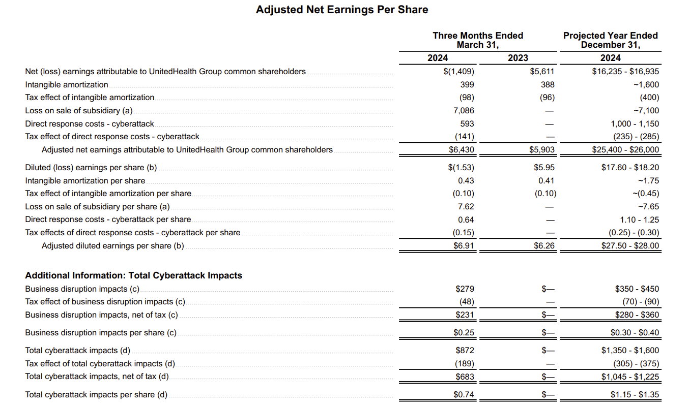 - $1.35 billion to $1.6 billion: Total cyberattack hit for 2024 as projected by UnitedHealth, or $1.15 a share to $1.35 a share.