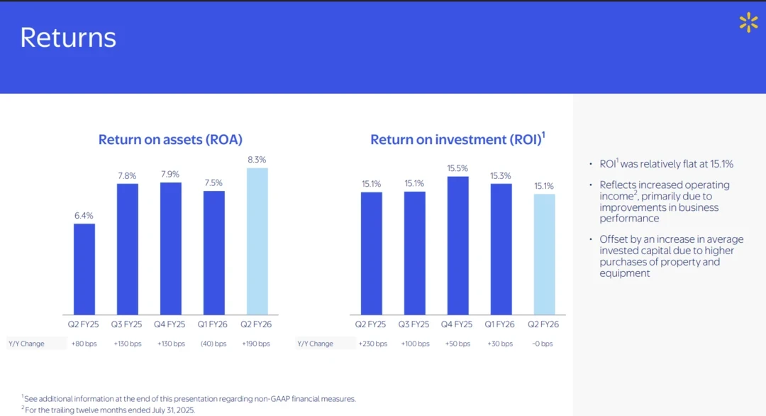 Walmart CFO John David Rainey noted the company is "fortunate to have opportunities to invest in ourselves in things like technology, AI, supply chain automation to drive returns in some cases, in the 20% range."