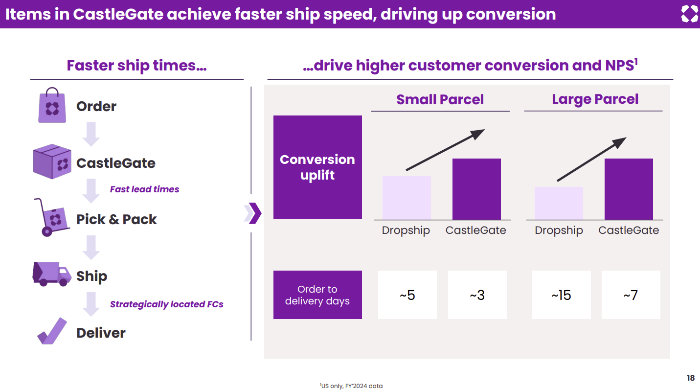 Supply chain and logistics. Wayfair has an inventory light approach to its supply chain, but CastleGate, the company's proprietary logistics network, is performing well. The network covers inbound logistics, storage and outbound fulfillment.