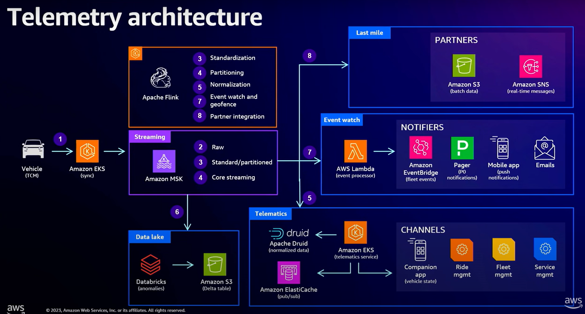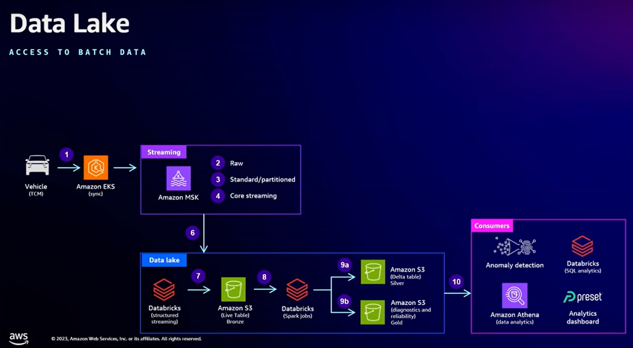 Rivianâs More noted that the raw data from AWS is streamed into Databricks architecture to create clean datasets that are then transformed into custom tables used for analytics. Thereâs also an event-watch architecture, which is used to surface anomalies in cabin temperature and critical signals. These events are processed using AWS services to send notifications (see Figure 11).