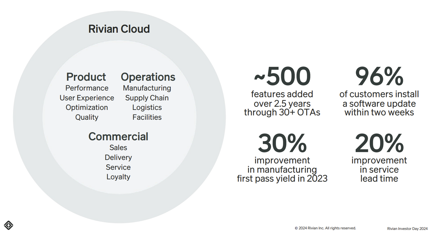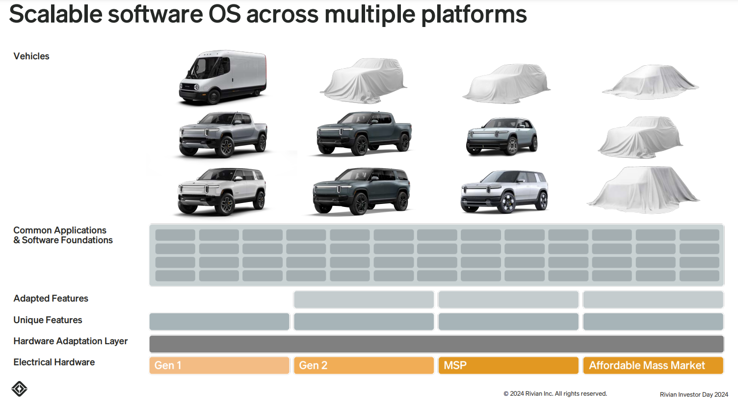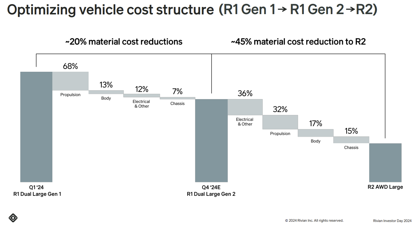 During the companyâs 2024 Investor Day in June, Scaringe talked about the transition to electric vehicles, building âhighly compelling products,â and leveraging vertical integration and scale as Rivian moves from its first-generation vehicles to its second with R2 and R3. Rivianâs strategy is Apple-ish in that it deeply integrates hardware, software, and experiences powered by data, ML, and AI.