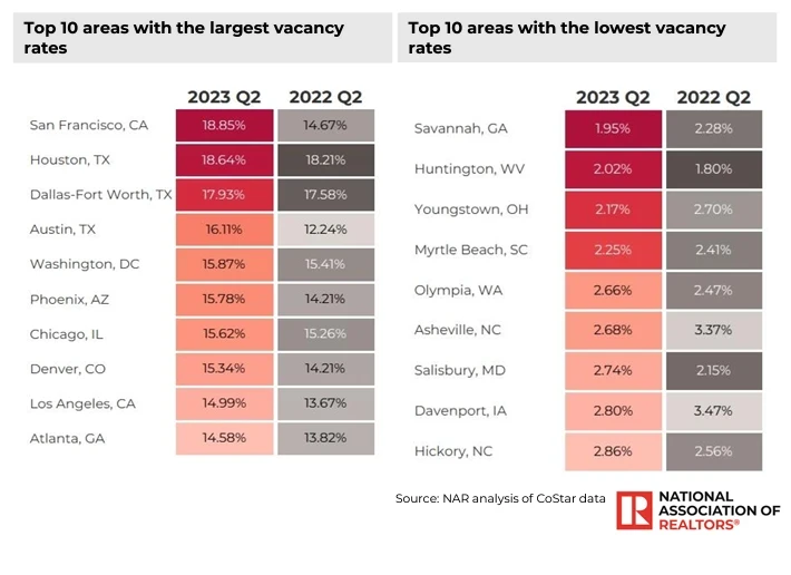 - The National Association of Realtors said first half office vacancies hit a new record high of 13.1% nationwide in the first half of 2023.