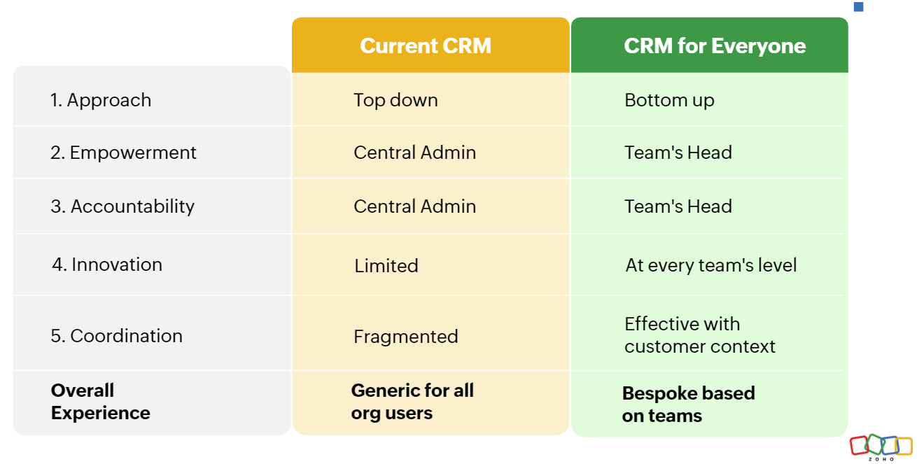 Constellation Research analyst Liz Miller said Zoho CRM for Everyone recognizes that an entire enterprise is involved with driving revenue. "This is a solution that meets the modern sales and engagement strategy, reaching beyond the stagnant notion that CRM is a record or a databaseâ¦it puts CRM at the center of the project called Revenue," said Miller.