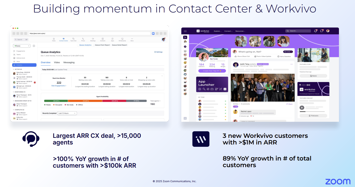 For contact center, Zoom said it signed its largest ARR deal in its history with a Fortune 100 company with more than 15,000 customers. Workvivo landed three deals worth more than $1 million in ARR.
