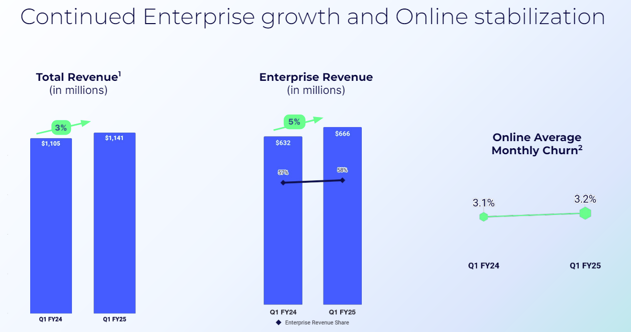 As for the outlook, Zoom projected second-quarter revenue of $1.145 billion to $1.15 billion with non-GAAP earnings of $1.20 a share and $1.21 a share. Sales were in line with estimates, but missed Wall Street earnings targets of $1.24 a share. For fiscal 2025, Zoom projected revenue of $4.61 billion and $4.62 billion with non-GAAP earnings of $4.99 a share to $5.02 a share. Both projections were ahead of expectations.