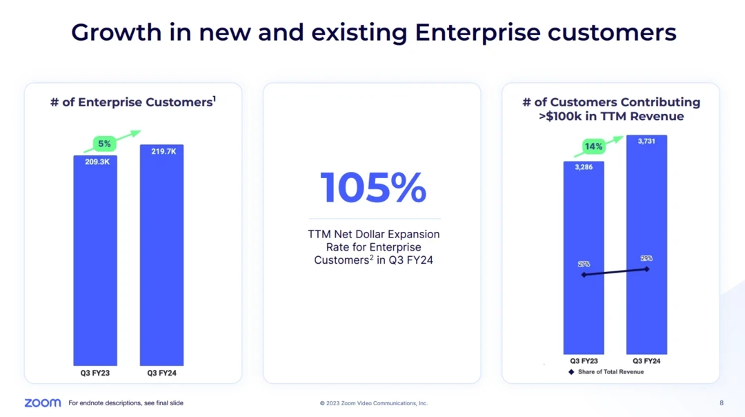 - Zoom ended the quarter with 219,700 enterprise customers, up 5% from a year ago.