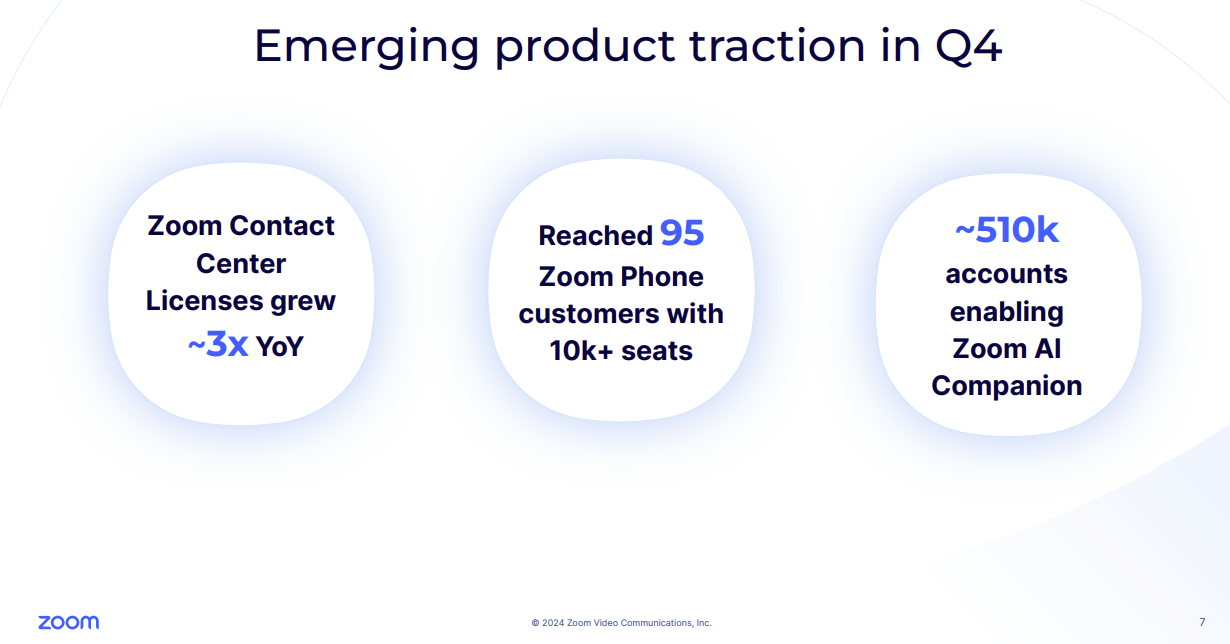 "Since its launch only five months ago, we expanded AI Companion to six Zoom products, all included at no additional cost to licensed users. But we are far from done. Our future roadmap for AI is 100% guided by driving customer value. We are hard at work developing new AI capabilities to help customers achieve their unique business objectives and weâll have more to share in a month at Enterprise Connect."