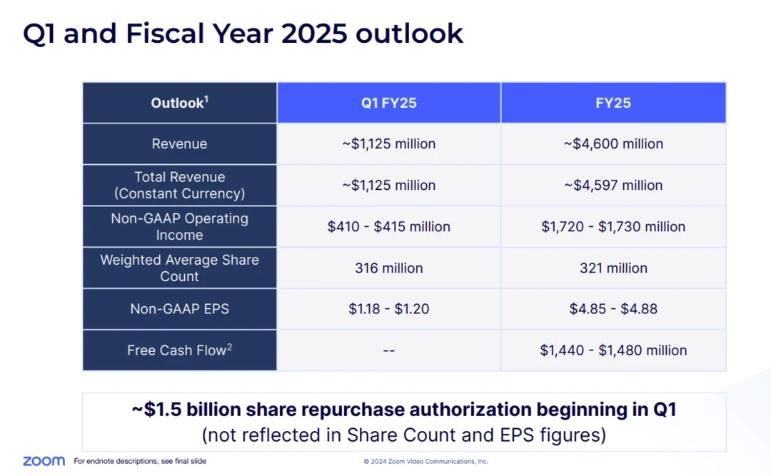 Zoom Video Communications reported a better-than-expected fourth quarter, raised its first quarter outlook and said it would buy back $1.5 billion in shares.