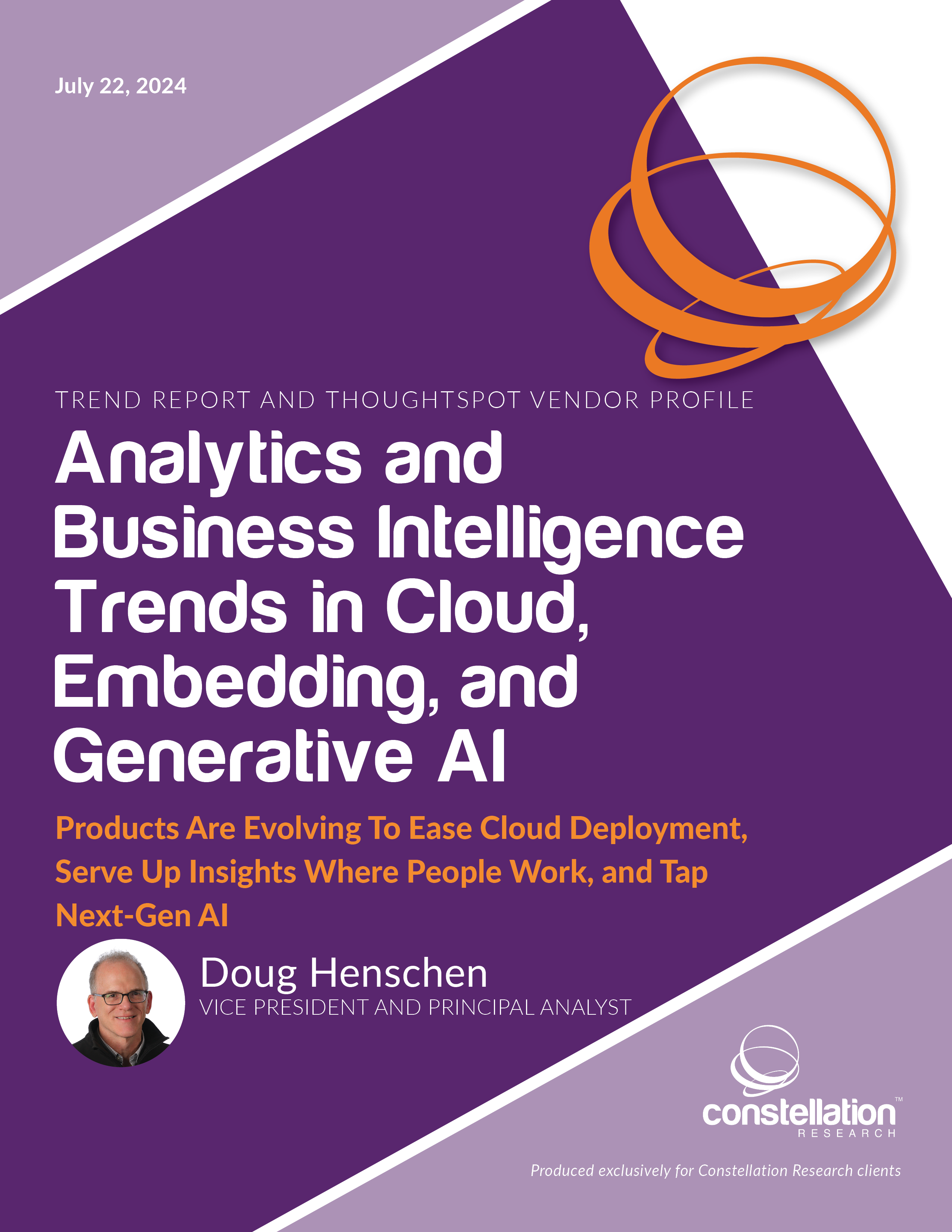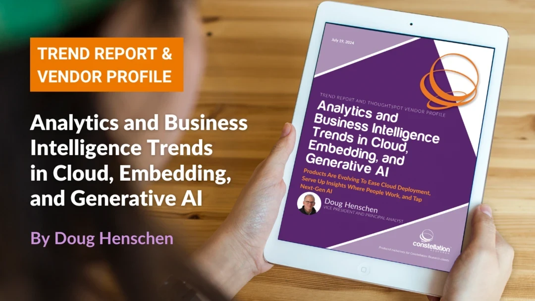 This Constellation Research Trend Report explains which analytics/BI capabilities are emerging to satisfy customer demand for cloud deployment options; explores more ways to embed analytics at the point of decision; and outlines ways to exploit next-generation machine learning (ML) and artificial intelligence (AI) capabilities, as well as including the very latest in GenAI. This report also includes Constellationâs independent analysis of analytics and BI vendor ThoughtSpot, with an overview and assessment of the companyâs strengths, weaknesses, and overall strategy. Early adopters should use this report to better understand trends in the analytics and BI market and ThoughtSpotâs capabilities, including its latest efforts to respond to cloud, embedded, and augmented trends.