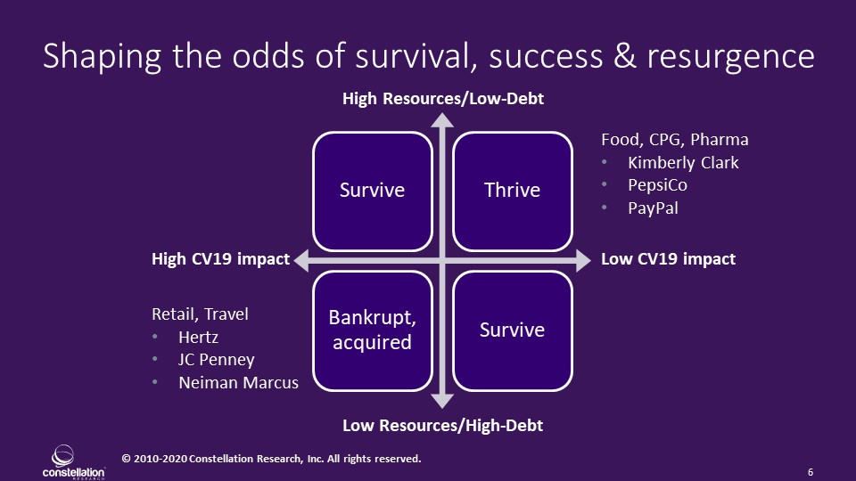 Just as certain underlying medical conditions make people more susceptible to COVID-19, certain underlying business conditions can make or break a company in a challenging economic climate. Being an analyst, Iâve come up with a two-by-two matrix (below) to explain. On the vertical axis are resources and debt, while the horizontal axis weighs the impact â lasting or not -- of the pandemic and lockdown.