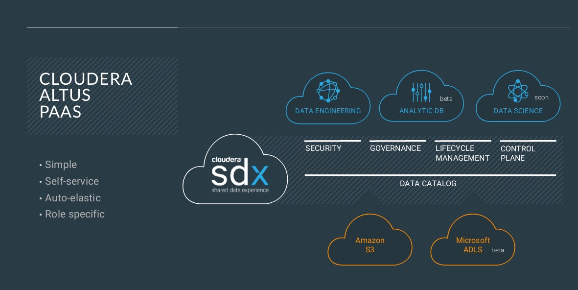 The Shared Data Experience is compelling, though at present itâs three parts reality and one part vision. The shared catalog is Hive and Hadoop centric, so Cloudera is exploring ways to extend the scope of the catalog and the data hub. Altus services are generally available for data engineering, but only recently entered beta (on AWS) for analytics deployments and persisting and managing SDX in the cloud. General availability of Cloudera Analytics and SDX services on Azure is expected later this year. Altus Data Science is on the roadmap, as are productized ways to deploy Altus services in private clouds. For now, private cloud deployments are entirely on customers to manage. In short, the all-options-covered rhetoric is a bit ahead of reality, but the direction is clear.