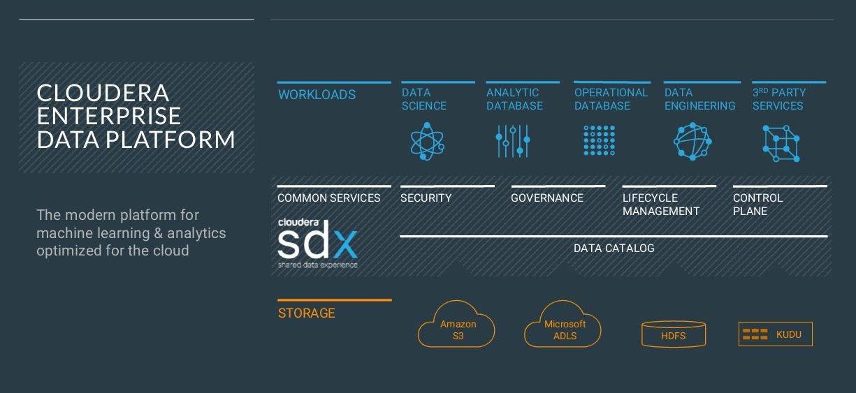 Supporting all these deployment modes is, of course, something that AWS and Google Cloud Platform (GCP) donât do and that Microsoft, IBM, and Oracle do exclusively in their own clouds. The key differentiator that Cloudera is counting on is its Shared Data Experience. SDX gives customers the ability to define and share data access and security, data governance, data lifecycle management and deployment management and performance controls across any and all deployment modes. Itâs the key to efficiently supporting both hybrid and multi-cloud deployments. Underpinning SDX is a shared data/metadata catalog that spans deployment modes and both cloud- and on-premises storage options, whether they are Cloudera HDFS or Kudu clusters or AWS S3 or Azure Data Lake object stores.