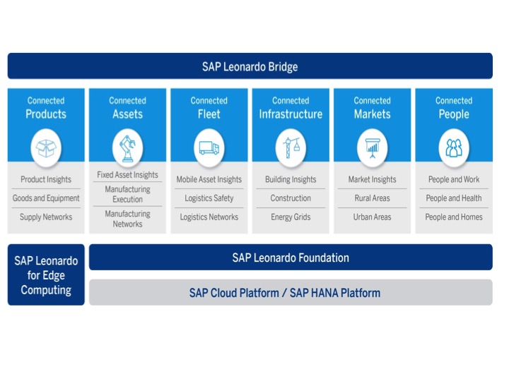 The result was the introduction of the SAP Leonardo a comprehensive portfolio of IoT capabilities each aimed at improving an individual Enterprise activity, but complete with integration architecture comprising of three major elements to ensure across the Enterprise integration and business value;