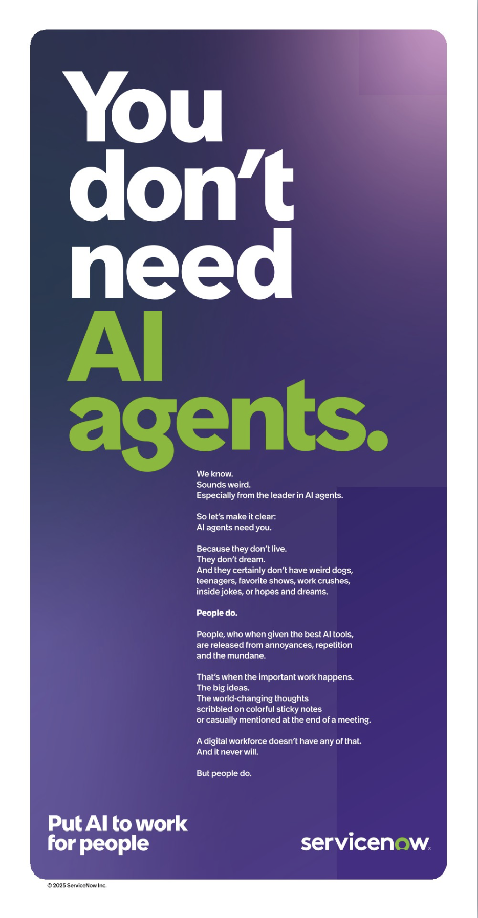 Telling the world you donât need AI agents is a bold move for a company that sells AI agents. But thatâs precisely what Colin Fleming, CMO of ServiceNow, launchedâ¦by way of a full-page ad unit in the Wall Street Journalâ¦on the first day of Salesforceâs Dreamforce. If Marketing could make a dis-track, this ad campaign hit Kendrick Lamar-level messaging. âAI Agents need you. Because they donât live, they donât dream, and they certainly donât have weird dogs, teenagers, favorite shows, work crushes, inside jokes, or hopes and dreams.â Setting aside that Idris Elba, ServiceNowâs traditional brand spokes-superstar and everyoneâs work crush, was nowhere to be seen in the ad unit, the simple and consistent message that AI agents are here to be put to work for humans screamed from the page. In a year when AI was cast as the star in every enterprise movie, the simple clarity and humanity of ServiceNow's ad campaign cut through the hype, promises, and disappointments of agency shortcomings and data failures.