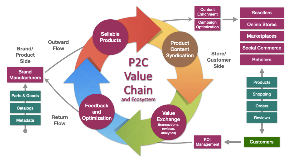 The world of e-commerce is rapidly becoming more systematized and ecosystem-oriented. The rise of product content syndication (PCS) that brings high degrees of automation, intelligence, and a vast connected partnership sensibility has changed the industry. PCS has made it even easier to rapidly build world-class e-commerce businesses connected to hundreds of product sources and digital stores across dozens of channels that are always up-to-date even during trying operational conditions. PCS is an integral but standalone element of a new, more sophisticated conception of modern digital commerce known as Products to Consumer (P2C) that seeks to maximize the total value of a given digital ecosystem, as can be seen in Figure 1 below. Please see the Constellation Research report Driving E-Commerce Growth With Product Content Syndication that explains the category in detail.