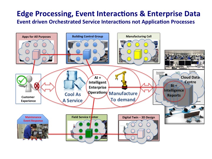 See the diagram below, which appears in Part 1, Understanding the Digital Business Operating model that illustrates this point. The independent enterprise activity âpoolsâ are shown, with the red lines illustrating orchestrations between the activity pools in a response to an external event in a customer building. This same reversal of the Business Model applies equally to the Technology Model, shifting the architecture from close-coupled state to alignment with fixed enterprise processes to loose coupled, stateless orchestrations in response to the events of Digital Business.