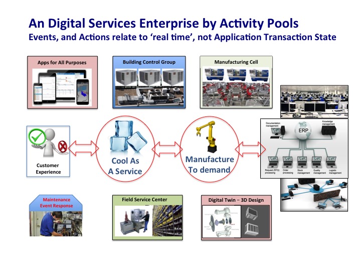 The organizational structure of a Digital Enterprise has to accommodate an increased number of functional activities able to operate in loose-coupled relationships driven by events. (As opposed to the tight coupled fixed relationship of a process driven Back Office Enterprise IT). The diagram below illustrates;