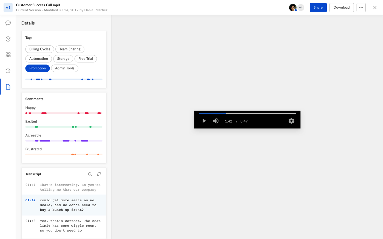 The example below shows how using IBM Watson, audio files stored in Box can be scanned for keywords and sentiment. The audio can be transcribed, and people can jump to any of the indexed times in the recording.