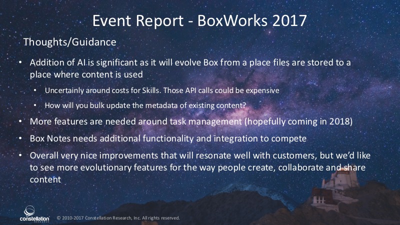 At last years conference (BoxWorks 2016) Box emerged with a very strong message of evolving from file storage and sharing, to being a platform for building applications. This years event successfully continued that story by introducing future functionality in the form of Box Skills (AI) and Box Graph (analytics). I was very impressed with the customer references and business partner announcements, both of which show that the ecosystem around Box is quite healthy and growing. I would like to see Box innovate more around the way content is created, organized and shared, as the competition in these areas is quite strong. Overall BoxWorks 2017 was an excellent event, and the customers and partners I spoke with are looking forward to getting their hands on the new functionality.