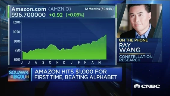 "Amazon is quickly becoming an A.I. company" stated R "Ray" Wang, Chairman and Principal Analyst at Constellation Research on CNBC's Squawk Box in this video clip. He noted that Amazon drives not only in the retail but the cloud computing sectors. It's been using its data and insights to drive recommendations and forecasts and enable it to reach its current position. As the second S&P 500 company to to break $1000 per share stated CNBC, Amazon has clearly demonstrated that it is a company worth watching, despite its high P/E ratio of 90.
