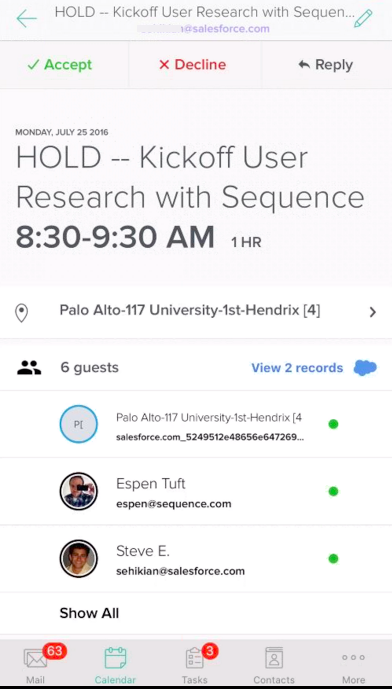 The new SalesforceIQ Inbox Calendar examines meeting invitees and shows connections to Salesforce CRM records for the attendees and their organizations. By providing information in context of the meeting invite, people don't need to copy/paste and manually switch between multiple applications to access the information and actions they need.