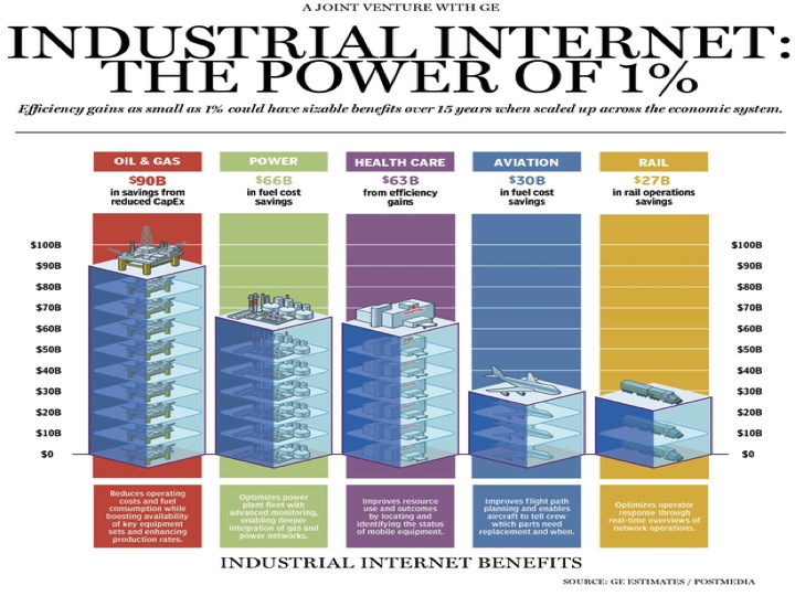 It is difficult to overview the many case studies presented, (here are some from GE website), but there can be little doubt that the goals of âThe Power of 1% Percentâ are on their way to being realized. (For more information see MIT Sloanâs review on GE strategic bet and Industrial Internet Case Studies from members). The next stage after the highly target improvement of GE products performance in the 1% strategy is to address the operation of their products as an ecosystem. The Rail Industry was one of the first targets for this level of Industry Transformation of overall operations as described in a GE Report dated March 2016.