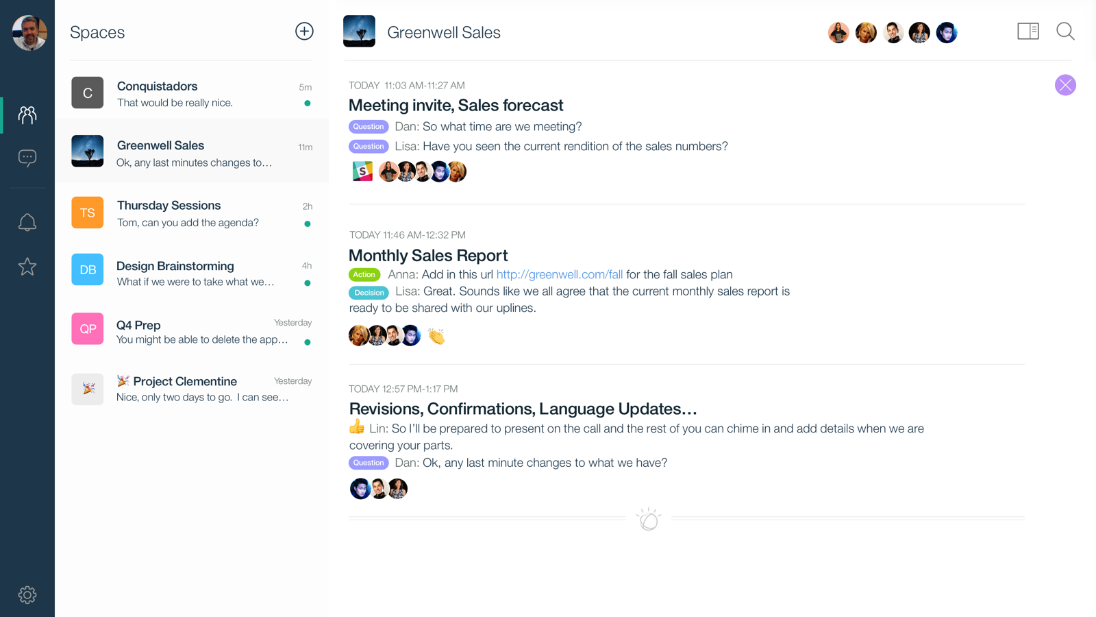 But bringing multiple applications into a single stream is not what makes Watson Workspace unique. There are several group messaging clients like Slack, Glip, Cisco Spark and Office 365 Groups that already do this. Watson Workspaceâs (current) differentiator is a new feature called Moments. Workspace Moments leverages the IBM Watson cognitive APIs to create a summary of the posts taking place in a Space. It groups together posts making it easier for people to digest the vast amounts of information being shared. Moments even labels the items in the summary as questions, actions or decisions to provide context around why these posts are the ones you should pay attention to.