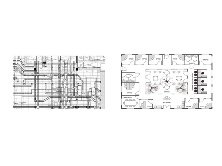 The example below shows, on the left, the representative Scan of the installed system, probably created by the installer, whilst on the right is an example of the kind of blueprint created by the architect. The Service Engineer is expected to integrate in his/her mind the two in order to locate physically the elements that need maintenance. Unless personally familiar with the offices and installation then this is a difficult task to achieve before work can even start. This problem has existed for many years, and has made âService Engineering managementâ a prime target for IoT deployment.