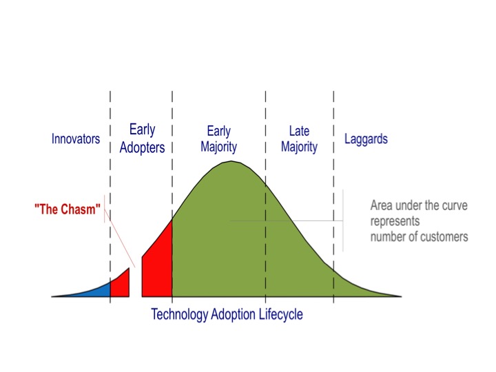 Its possible to use the Crossing the Chasm approach not only for its original purpose of defining go to market phases for a product or a startup vendor, but to define/align your Enterprise timing to adopting a particular technology shift. The rate at which the innovative technology disruption is turning into understandable Business value, and then to sector, or activity transformation can be measured by tracking product adoption across the stages.