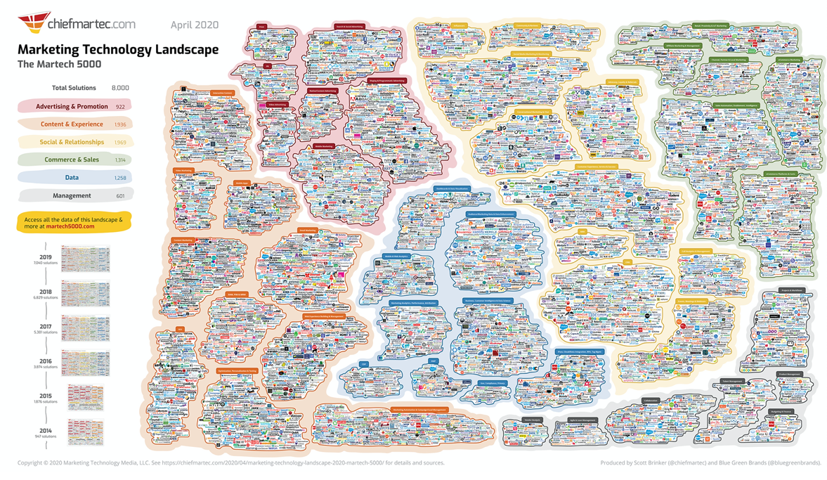 I mean seriouslyâ¦the 2020 update to the Marketing Technology Landscape looks more like a map in Clash of Clans than a segmented visualization of a technology category. It now tips the scales at over 8,000 solutions and I am really fighting the urge to use quotations around the word solutions.
