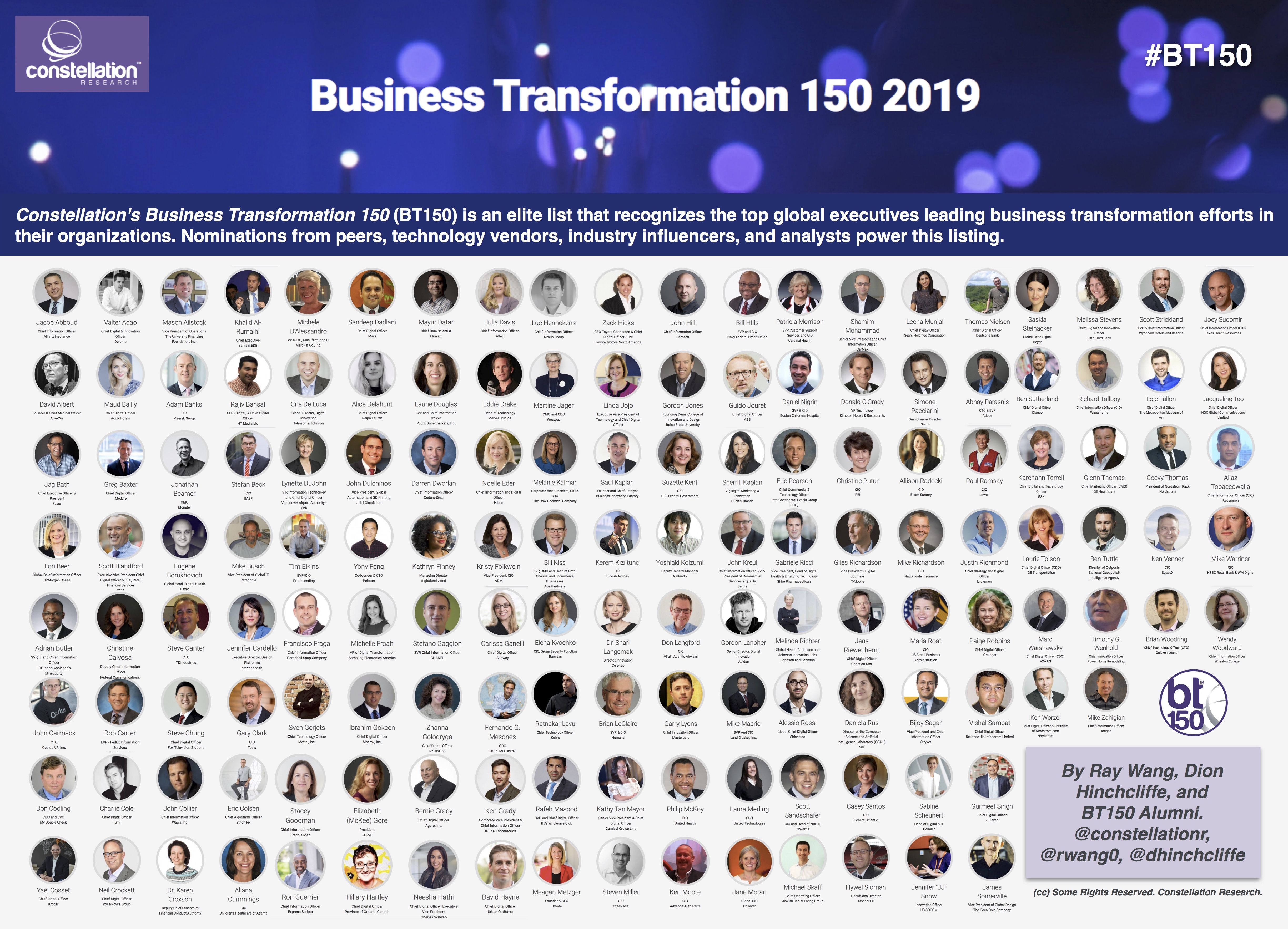 Nearly a third of last year's inductees had in-person representation at Constellation Connected Enterprise (CCE) to accept their induction on stage into the BT150. We are expecting many of the BT50 for 2019 to attend in person as well. The goal of building the BT150 list each year is to a) help improve industry storytelling in an important sector that badly needs it, b) foster innovation and cross pollination of significant new ideas among leaders, c) identify new and more effectie digital leadership techniques, d) to better foster and encourage positive digital change and transformation, and e) identify major accomplishments and leadership in the world of the digital enterprise.