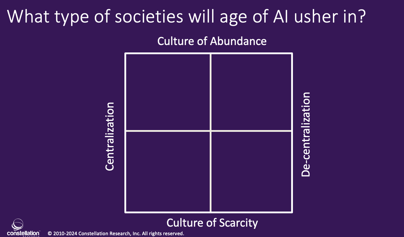 Society has often swung from centralization to decentralization and back in the distribution of power and rights. Living in a culture of abundance versus a culture of scarcity can alter the prioritization of decisions, the quality of interactions, and the overall optimism or pessimism of a society. AI has the power to transform societies for both good and evil.