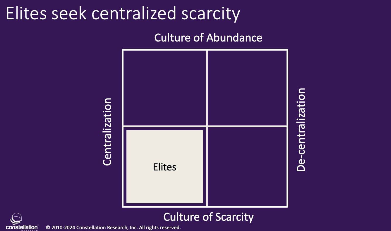 The rapid digitization of the physical world brings more centralized control in the hands of the few. Many of the global elite see AI as an opportunity to impress their values at scale without checks and balances and rigorous public discourse. Those who seek decentralized abundance, will have to work hard to battle the elites who seek centralized scarcity.