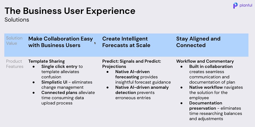 The goal of reaching a broader audience drove a second big announcement at Planful Perform: a new collaborative business user experience. This is the companyâs second stab at bringing budget-owners and plan-contributors into financial processes, but these business-user types were slow to adopt an earlier âMyPlanâ interface. Halloran reassured Perform attendees that the new business user experience delivers an âintuitive, zero-trainingâ interaction.