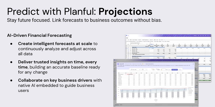 The biggest announcement at Perform was the general availability of Predict: Projections, the second of two predictive capabilities introduced by the software-as-a-service (SaaS) vendor over the last two years. The goal with Predict: Projections is to use artificial intelligence (AI) to accelerate and scale up financial forecasting. Importantly, itâs a computer-augmentation capability that âkeeps a human in the loop,â pointed out Planful CEO Grant Halloran during his opening keynote.