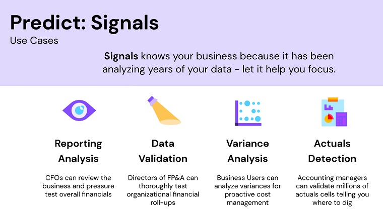 Predict: Signals, introduced in 2021 and the first predictive feature that Planful delivered, went through a rewrite based on early customer feedback. Now in use by roughly 100 Planful customers -- about 10% of the customer base -- Signals is akin to a virtual fact checker that flags data points that are questionable. Here, too, itâs up to the human to heed or disregard a Signal, based on their knowledge of why exceptions might have occurred.