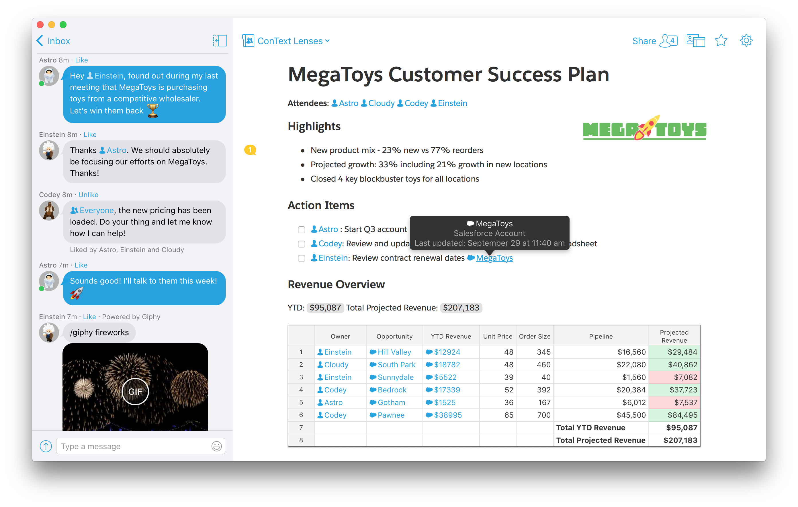 In my opinion, Quip is one of the most important acquisitions Salesforce has made. Today you can have conversations around a record via Chatter, and you can attach relevant files (say a sales presentation or product catalog) to a record. But imagine in the future if every Salesforce record has a âliving documentâ as part of it, enabling people to collaboratively take notes, brainstorm ideas, generated reports, track tasks and more. Quip could be one of the most important pieces to a larger puzzle Salesforce has been working on.