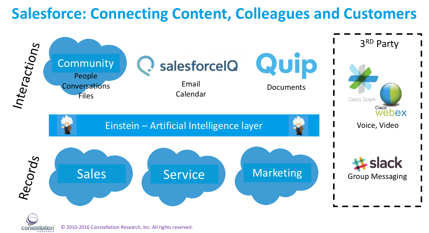 While Salesforce is not quite ready to compete with Microsoft (Office 365) and Google (G Suite) yet, they have assembled (via build, buy and partner) many of the components employees use to get their jobs done. Employee can use SalesforceIQ to access their email and calendar, Chatter for social networking and files, and now Quip to create and share documents and spreadsheets. Add Salesforce records to those applications, and sprinkle in some intelligence powered by Einstein and you can start to picture an environment where employees all across the company spend a great deal of their work day inside Salesforce products. Maybe itâs time for a name change from Salesforce to Workforce?
