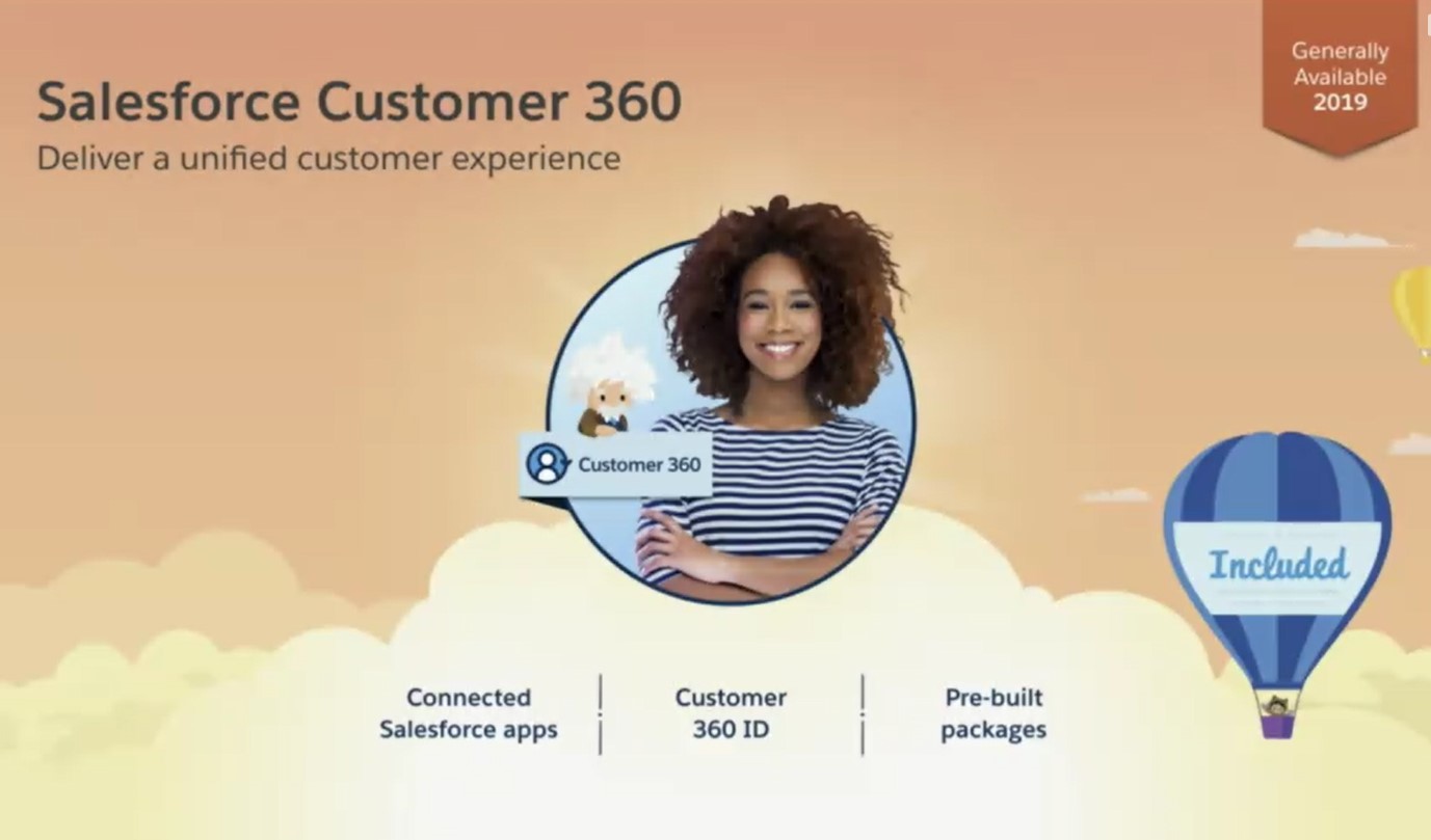 Customer 360 will provide a built-in (free) service that will resolve customer identities and ongoing changes across Salesforce clouds, but it won't be available until the second half of 2019.