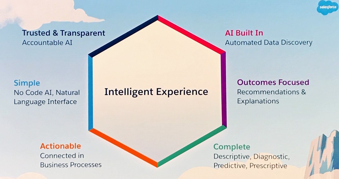 On the blending of Einstein Analytics and Discovery, this is a welcome step and I really liked the vision of a holistic, âintelligent experienceâ (shown above) that Salesforce presented. Salesforce isn't trying to sell Einstein Analytics to a handful of analysts who will build dashboards and reports for everybody else; itâs trying to deliver embedded analytics and smart capabilities to every CRM user.