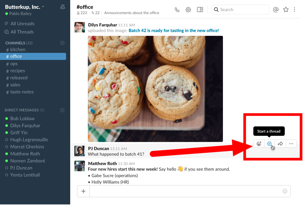 You start a thread by hovering over a message, and clicking the new "Start a thread" icon. Given Slack's focus on user design, friendliness and fun, I'm a bit I'm surprised by the choice of the rather technical term "thread" versus something more natural like conversation, reply or comment, but naming aside, threads are a very welcome addition.