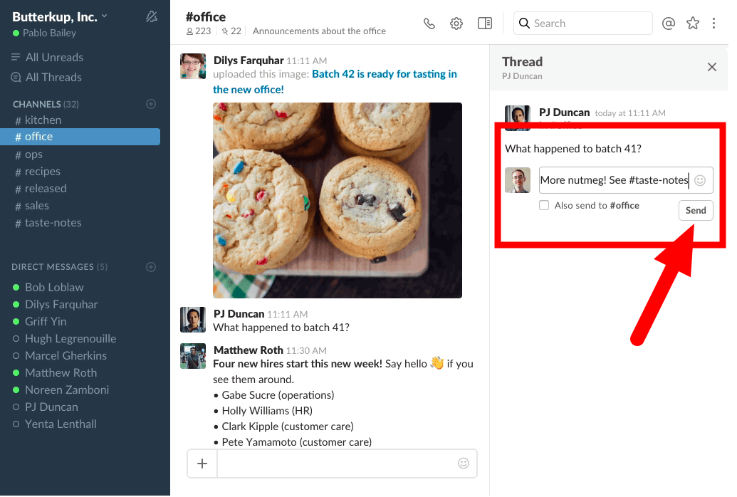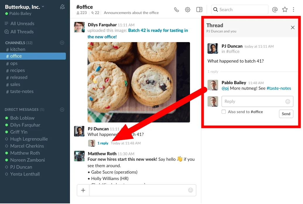 This opens the message on the right hand side of the screen, which Slack calls the Flexpane. There you can read the entire conversation and add new replies.