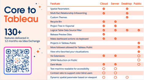 Tableau reassured its customer base by announcing continued investment in Tableau Cloud, Server, Public, and Desktop. Tableauâs CPO, Southard Jones, said he dedicated over half of his development resources to delivering over 130 features (see figure below) to those platforms in the last 12 months. He committed to the audience and later shared his continued roadmap of investments across the Tableau product lines with analysts. This included announcing the Tableau Blueprint to help its customers lead the change towards an agent-powered future.